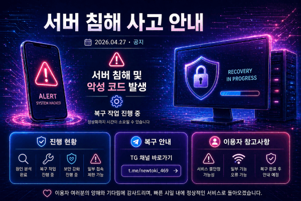 우리 서버에 침해가 들어오는 바람에 페이지가 변조되고 악성 코드가 삽입되는 문제가 발생했습니다. 현재 서버 전체를 점검하며 악성 코드를 제거하는 작업을 병행 진행하고 있는데, 완전히 정상 돌아오려면 시간이 좀 필요할 것 같습니다.